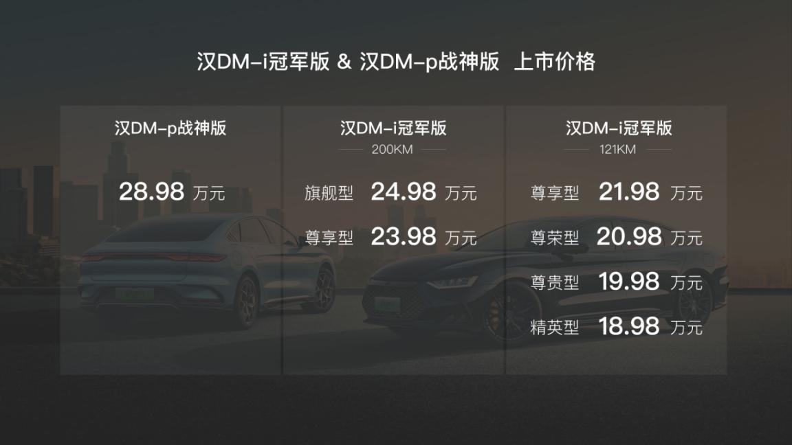 此次,產(chǎn)品實(shí)力全面進(jìn)階的漢DM系列兩款車(chē)型中,漢DM-i冠軍版的價(jià)格區(qū)間為18.98萬(wàn)元~24.98萬(wàn)元,漢DM-p戰(zhàn)神版的價(jià)格為28.98萬(wàn)元。此外,全新漢DM系列還為用戶(hù)準(zhǔn)備了5大智聯(lián)在線服務(wù)、5大專(zhuān)屬貴賓服務(wù)、2大無(wú)憂購(gòu)車(chē)政策等多重購(gòu)車(chē)禮遇。