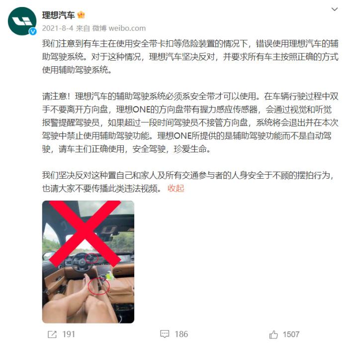 針對(duì)上述行為,理想汽車在2021年曾通過(guò)微博回應(yīng)稱,“理想汽車的輔助駕駛系統(tǒng)必須系安全帶才可以使用。在車輛行駛過(guò)程中雙手不要離開(kāi)方向盤,理想ONE的方向盤帶有握力感應(yīng)傳感器,會(huì)通過(guò)視覺(jué)和聽(tīng)覺(jué)報(bào)警提醒駕駛員,如果超過(guò)一段時(shí)間駕駛員不接管方向盤,系統(tǒng)將會(huì)退出并在本次駕駛中禁止使用輔助駕駛功能?!?/p>