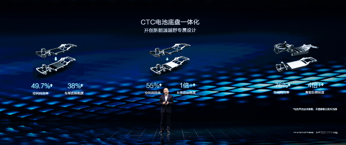 傳統(tǒng)越野車為了提升車身扭轉(zhuǎn)剛度和通過性,對大梁進(jìn)行專門強(qiáng)化,這也將進(jìn)一步加大整車重量,并抬升整車重心。DMO以創(chuàng)新性理念,給出“兩全其美”的解決方案:將具備本征安全的刀片電池和高強(qiáng)度鋼大車架強(qiáng)強(qiáng)融合,演化出真正的CTC電池底盤一體化技術(shù)。刀片電池既是能量體、也是結(jié)構(gòu)件,不僅能保證極端越野場景下的電池安全,還能帶來更多的整車安全提升。
