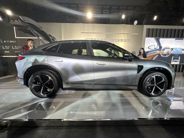 車身側(cè)面,新車采用溜背式設計,整體造型流暢且動感;無框式車門、隱藏式車門把手搭配大尺寸五輻式輪圈以及黑色輪眉裝飾,運動感極強。
