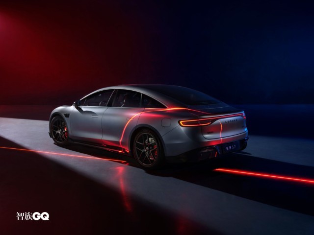 新車(chē)側(cè)面造型較為飽滿(mǎn)、流暢,略微向下傾斜的車(chē)頂線條搭配隱藏式車(chē)門(mén)把手和車(chē)窗邊框處的鍍鉻飾條進(jìn)行點(diǎn)綴時(shí)尚感較強(qiáng)。此外,智界S7還配備五輻式熏黑輪圈和紅色涂裝的高性能剎車(chē)卡鉗。車(chē)尾部分,修長(zhǎng)的貫穿式LED尾燈組點(diǎn)亮后辨識(shí)度較強(qiáng),鴨尾式擾流板與寬大的亮黑色后包圍組件則增強(qiáng)了車(chē)尾的視覺(jué)層次感。