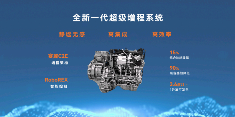 作為一種全新的高集成化解決方案,賽翼增程架構(gòu)通過高度集成化的設(shè)計,使得增程系統(tǒng)的體積更小、重量更輕,從而減少了運行過程中的振動和噪音。同時,配合RoboREX智能增程控制技術(shù),實現(xiàn)了智能主動能量管理,使增程器由被動工作變?yōu)橹鲃庸ぷ?,不僅提高了能源利用效率,還進(jìn)一步降低了噪音感知。據(jù)悉,全新一代賽力斯超級增程系統(tǒng)綜合油耗降低15%,噪音感知降低了90%,增程器實際效率超過3.6kWh/L,達(dá)到了行業(yè)量產(chǎn)增程器的領(lǐng)先水平。