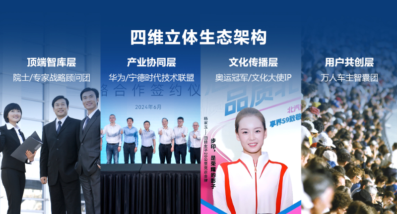 “品牌摯友計(jì)劃”是北汽集團(tuán)“品牌三年躍升行動(dòng)”的重要引擎,構(gòu)建一個(gè)“四維立體生態(tài)”:頂端智庫(kù)層,邀請(qǐng)?jiān)菏?、專家、?jīng)濟(jì)學(xué)家組成戰(zhàn)略顧問(wèn)團(tuán);產(chǎn)業(yè)協(xié)同層,與華為、寧德時(shí)代等合作伙伴共建技術(shù)品牌聯(lián)盟;文化傳播層,攜手奧運(yùn)冠軍、文化名人打造"美好出行大使"IP;用戶共創(chuàng)層,建立萬(wàn)人級(jí)車主智囊團(tuán)。除了外部資源,品牌摯友計(jì)劃還將逐步拓展至20位內(nèi)部管理者及300名KOE員工。