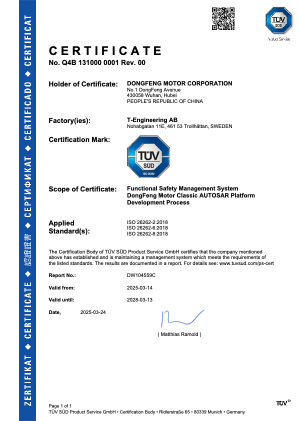 東風(fēng)汽車AUTOSAR基礎(chǔ)軟件平臺開發(fā)流程獲TüV南德意志集團(tuán)認(rèn)證證書