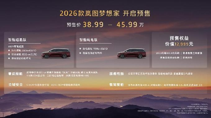 8月29日,第二十八屆成都國際汽車展覽會盛大開幕。全面煥新升級的“新時代旗艦MPV”2026款嵐圖夢想家預售亮相。本次新車共推出智能超混版和智能純電版兩個動力版本,預售價為38.99萬-45.99萬,同步推出了價值超萬元的多項重磅權益,包括2000元抵5000元尾款的膨脹金,終身免費三電質保、終身免費基礎保養(yǎng)和優(yōu)先交付提車。9月1日起,2026款嵐圖夢想家展車、試駕車將陸續(xù)到店,消費者可以進店親自體驗新車的獨特魅力。