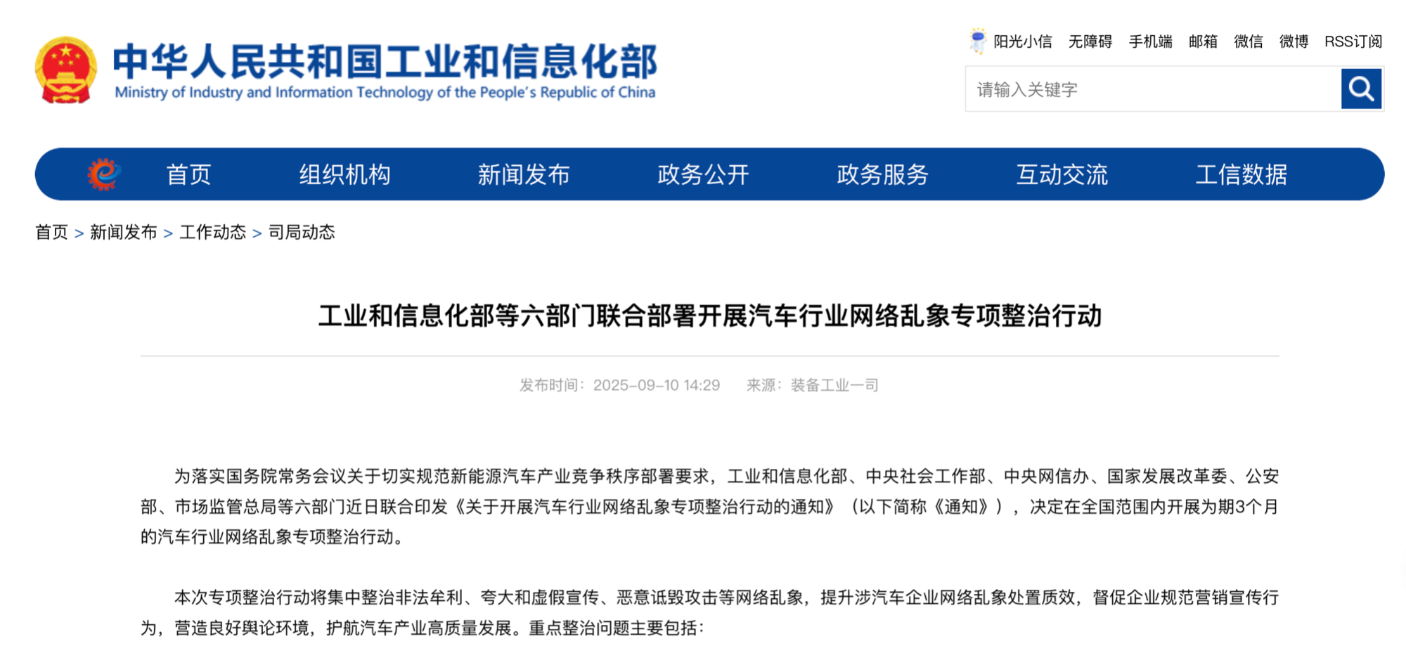 央廣網(wǎng)北京9月10日消息(記者董楠)9月10日,工業(yè)和信息化部(以下簡稱“工信部”)、中央社會工作部、中央網(wǎng)信辦、國家發(fā)展改革委、公安部、市場監(jiān)管總局等六部門聯(lián)合印發(fā)《關(guān)于開展汽車行業(yè)網(wǎng)絡(luò)亂象專項(xiàng)整治行動的通知》,決定在全國范圍內(nèi)開展為期3個(gè)月的汽車行業(yè)網(wǎng)絡(luò)亂象專項(xiàng)整治行動。