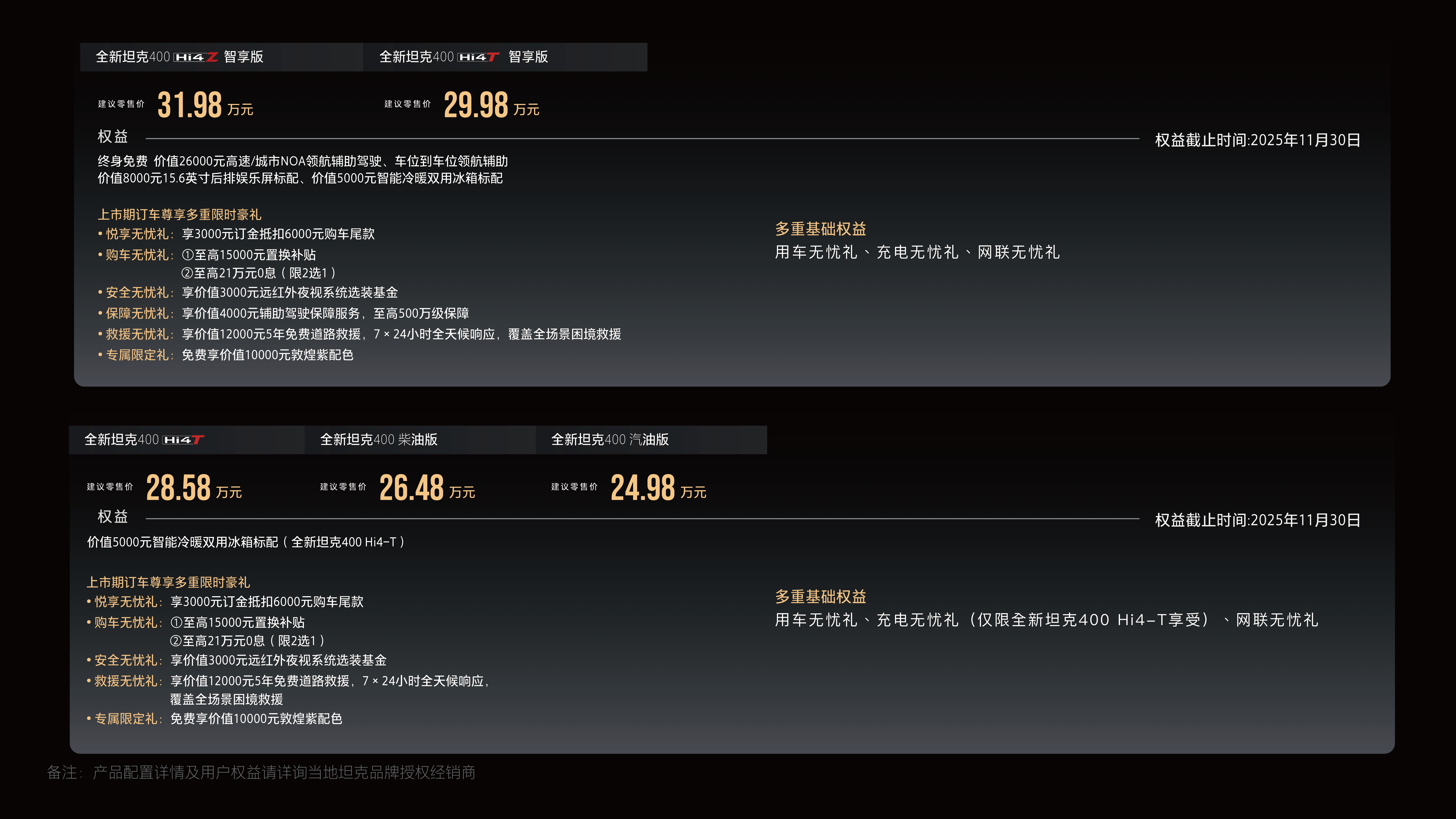 全新坦克400 Hi4-Z智享版,售價31.98萬元;全新坦克400 Hi4-T智享版,售價29.98萬元;全新坦克400 Hi4-T,售價28.58萬元;全新坦克400 柴油版,售價26.48萬元;全新坦克400 汽油版,售價24.98萬元。即刻下單可享多重尊崇權(quán)益,坦克以滿滿誠意為用戶帶來驚喜購車優(yōu)惠。