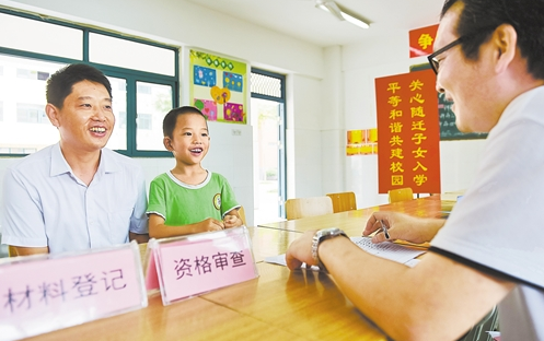 在安徽合肥市和平小學(xué)花沖分校報(bào)名點(diǎn),畢權(quán)航和父親畢金倉(cāng)(左)在辦理報(bào)名入學(xué)相關(guān)手續(xù)(2017年7月12日攝)。合肥市瑤海區(qū)進(jìn)城務(wù)工人員隨遷子女入學(xué)報(bào)名工作啟動(dòng)后,該區(qū)教育部門在各定點(diǎn)學(xué)校設(shè)置“隨遷子女入學(xué)幫你辦”窗口,安排工作人員協(xié)助辦理,同時(shí)設(shè)置家長(zhǎng)意見箱,監(jiān)督入學(xué)辦理的全過程。 新華社記者 張 端攝