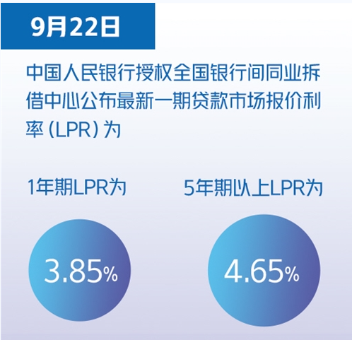 9月22日,中國人民銀行授權(quán)全國銀行間同業(yè)拆借中心公布最新一期貸款市場報價利率(LPR)為:1年期LPR為3.85%,5年期以上LPR為4.65%。兩項貸款市場報價利率均連續(xù)18個月保持這一水平。