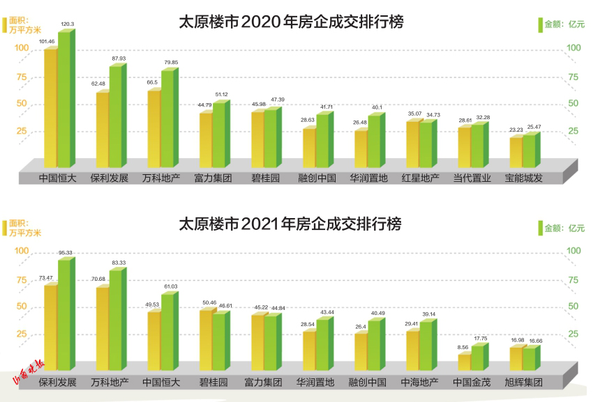 同時(shí),2020年排名第一的中國(guó)恒大,在太原的年銷售額超過(guò)了120億元;2021年排名第一的保利發(fā)展銷售額為95.33億元,沒(méi)有跨過(guò)百億門(mén)檻。在成交面積方面,恒大2020年的總銷售面積超過(guò)了100萬(wàn)平方米,而2021年保利發(fā)展的總銷售面積為73.47萬(wàn)平方米,比上一年的銷售面積冠軍縮水了近三成。