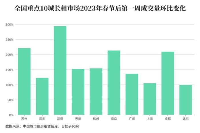 今年春節(jié)期間,中國的旅游、文娛、餐飲等市場明顯升溫,春節(jié)復工后隨著人員流動量增加。智庫和研究院方面認為,住房租賃市場的穩(wěn)步回暖應(yīng)是趨勢。在長租市場成交量整體呈回升趨勢時,新一線城市的增長幅度明顯高于一線城市。智庫和研究院方面分析,環(huán)比春節(jié)前,北京、上海、深圳三大一線城市春節(jié)后第一周成交量環(huán)比提升近100%;而武漢、南京、成都等新一線城市環(huán)比成交量增長近200%,其中武漢增長約300%。