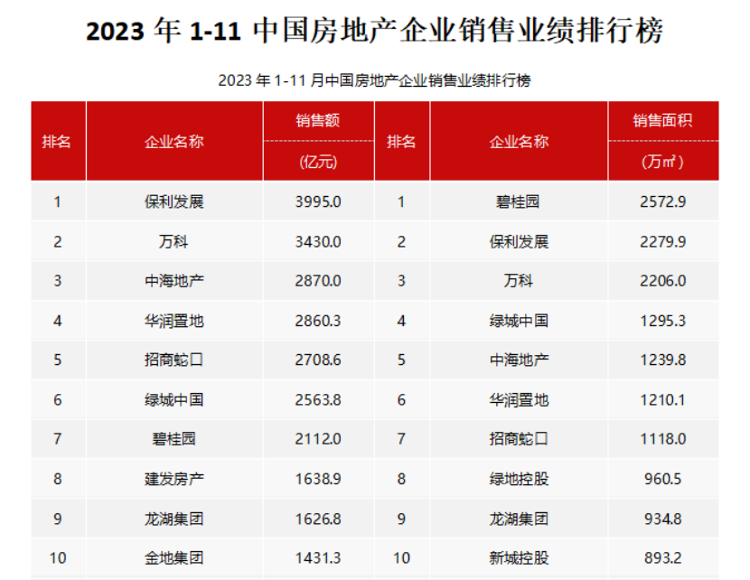 從企業(yè)表現(xiàn)來看,央國企銷售表現(xiàn)仍較為強勁。2023年1-11月,銷售額同比增長超過10%的大型企業(yè)為,中海、華潤、建發(fā)、越秀、華發(fā)、聯(lián)發(fā)、國貿(mào)地產(chǎn)、中建壹品、中建東孚、象嶼地產(chǎn)等,這些企業(yè)銷售增長較為強勁。