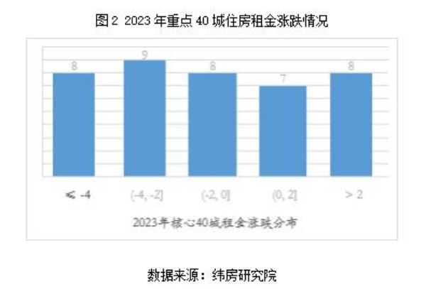 從漲跌結構看,緯房研究院數(shù)據顯示,2023年重點40城中有15個城市住房租金同比上漲,其余25個城市住房租金同比下降。住房租金上漲的城市中,7個城市漲幅在2%以內,8個城市漲幅超過2%;住房租金下跌的城市中,8個城市跌幅在2%以內,9個城市跌幅在2-4%;8個城市跌幅超過4%。