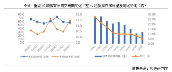 依據貝殼研究院數(shù)據監(jiān)測,全國重點40城2023年三季度房客源成交周期分別為56.7、11.5天,房源成交周期環(huán)比減少2.1天,同比增加2.7天;客源成交周期環(huán)比延長1天,同比延長1天。隨著個人租賃房源供應的增加,疊加保障性租賃住房、市場化集中式租賃房源的增加,個人業(yè)主出租房源出租速度減緩。從庫存房源來看,2023年1-9月租賃庫存房源量均呈現(xiàn)同比增加的趨勢,與此同時,租客租房面臨的選擇項增多,租客對于租賃房源可選類型和房源量均有增加。