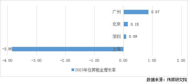 多數(shù)一線城市住房租金微漲,個別租金下跌。一線城市中,廣州、北京和深圳2023年住房租金分別上漲0.87%、0.15%和0.09%。上海住房租金下跌3.85%。