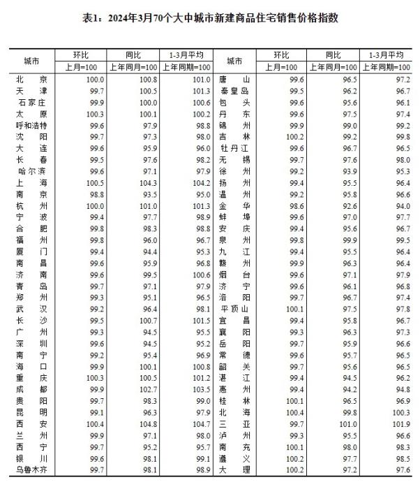 2024年3月70個(gè)大中城市新建商品住宅銷售價(jià)格指數(shù)。 截圖自國(guó)家統(tǒng)計(jì)局官網(wǎng) 新房?jī)r(jià)格上漲城市數(shù)量增加 房?jī)r(jià)上漲城市數(shù)量的增加從很大程度上體現(xiàn)了市場(chǎng)的變化。梳理發(fā)現(xiàn),3月份新房?jī)r(jià)格上漲的城市數(shù)量有所增加,從2月份的8個(gè)增至11個(gè)。 “房?jī)r(jià)上漲城市數(shù)量增加,充分說(shuō)明部分城市開始率先進(jìn)入到樓市基本面修復(fù)、價(jià)格指標(biāo)向好調(diào)整的階段?!币拙友芯吭貉芯靠偙O(jiān)嚴(yán)躍進(jìn)表示。 廣東省城規(guī)院住房政策研究中心首席研究員李宇嘉提出,上海、西安、北海、太原、重慶漲幅居前,主要是改善盤推盤價(jià)格上升所致。 再看具體的價(jià)格變動(dòng),一線城市新建商品住宅銷售價(jià)格環(huán)比下降0.1%,降幅比上月收窄0.2個(gè)百分點(diǎn),其中,北京持平,上海上漲0.5%,廣州和深圳分別下降0.7%和0.4%。二、三線城市新建商品住宅銷售價(jià)格環(huán)比分別下降0.3%和0.4%,降幅均與上月相同。 “從新房來(lái)看,一線城市的下降幅度明顯收窄,其中北上的穩(wěn)定性表現(xiàn)得更好。”58安居客研究院院長(zhǎng)張波認(rèn)為,二三線城市中重慶、西安、吉林等地的房?jī)r(jià)環(huán)比出現(xiàn)上漲,更多也是受供給結(jié)構(gòu)影響。 張波還表示,從安居客監(jiān)測(cè)的數(shù)據(jù)來(lái)看,3月份重點(diǎn)65城新房新開盤數(shù)量環(huán)比大漲155%,其中一線城市環(huán)比漲幅更是接近350%,新房存量規(guī)模小幅上升。3月房企加大優(yōu)惠促銷力度。 “新房市場(chǎng)如果能夠在高端盤的帶動(dòng)下,在前期二手房的消化下,能夠帶動(dòng)需求入市可能會(huì)有企穩(wěn)的跡象?!崩钣罴握J(rèn)為。