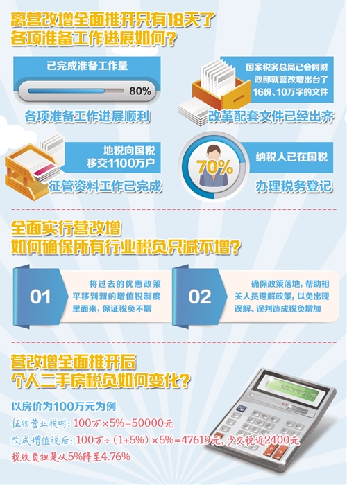 營改增全面推開后,將新增建筑業(yè)、房地產(chǎn)業(yè)、金融業(yè)和生活服務(wù)業(yè)等四大行業(yè),涉及納稅人1100萬戶左右。利益調(diào)整范圍之廣,改革難度之大,可見一斑。當(dāng)前,改革各項(xiàng)工作正在有條不紊地推進(jìn)。對于如何確保行業(yè)稅負(fù)只減不增、中央與地方政府增值稅收入如何分配等熱點(diǎn)問題,有的制度安排已經(jīng)完備,有的指導(dǎo)原則也已確立—— 4月12日,距全面推開營改增試點(diǎn),還有18天。 隨著時(shí)針“滴答滴答”向前,“本屆政府成立以來規(guī)模最大的一次減稅”的關(guān)注度也在不斷升溫:試點(diǎn)準(zhǔn)備情況如何、能否兌現(xiàn)所有試點(diǎn)行業(yè)稅負(fù)“只減不增”、不動(dòng)產(chǎn)納入抵扣范圍會(huì)否抬高房價(jià)、增值稅收入央地如何劃分……針對這些熱點(diǎn)問題,12日上午,國務(wù)院新聞辦舉行吹風(fēng)會(huì),財(cái)政部副部長史耀斌、國家稅務(wù)總局副局長汪康回答了記者提問。 記者:營改增試點(diǎn)涉及范圍廣,改革難度高,離全面推開也只剩不到20天。當(dāng)前各項(xiàng)準(zhǔn)備工作進(jìn)展如何? 汪康:目前,各項(xiàng)準(zhǔn)備工作進(jìn)展順利,已完成了準(zhǔn)備工作量的80%。國家稅務(wù)總局已會(huì)同財(cái)政部就營改增出臺了16份文件,目前改革配套文件已經(jīng)出齊。與此同時(shí),地稅向國稅移交1100萬戶征管資料的工作已完成,70%的納稅人已經(jīng)在國稅辦理了稅務(wù)登記。 此外,5月份,納稅人所需要的4億多份發(fā)票也將如期發(fā)放各地。為保障納稅申報(bào)工作順利進(jìn)行,稅務(wù)部門有針對性地推出多項(xiàng)舉措,比如將6月份納稅申報(bào)期由15日延遲到25日;A級納稅人、B級納稅人從5月1日開始取消增值稅專用發(fā)票的認(rèn)證,對本次納入試點(diǎn)的納稅人在三個(gè)月內(nèi)取消專用發(fā)票的認(rèn)證等。我們將以精益求精的工匠精神扎實(shí)細(xì)致地抓好各項(xiàng)準(zhǔn)備工作,確保所有企業(yè)5月1日能順利開票,6月1日能順利申報(bào)。 記者:今年的《政府工作報(bào)告》提出,全面實(shí)行營改增,確保所有行業(yè)稅負(fù)只減不增。如何保證這一要求落到實(shí)處? 史耀斌:實(shí)現(xiàn)“所有行業(yè)稅負(fù)只減不增”,將從兩大方面來落實(shí)。第一,在試點(diǎn)方案設(shè)計(jì)上體現(xiàn)只減不增的內(nèi)涵。對4個(gè)行業(yè)原稅收優(yōu)惠政策原則上予以延續(xù)。比如對養(yǎng)老、醫(yī)療、教育、金融機(jī)構(gòu)的同業(yè)往來、發(fā)票發(fā)行等繼續(xù)實(shí)施免稅,延續(xù)個(gè)人轉(zhuǎn)讓住房的征免稅政策等。也就是說,將過去的優(yōu)惠政策平移到新的增值稅制度里面來,保證稅負(fù)不增。 對于建筑業(yè)和房地產(chǎn)業(yè)來說,周期比較長,并非都是5月1日開始的新工程,對這些老項(xiàng)目、老工程,將繼續(xù)實(shí)行政策平轉(zhuǎn),允許建筑工程的老合同、房地產(chǎn)的老項(xiàng)目選擇適用簡易計(jì)稅方法征稅,和過去計(jì)稅辦法是一樣的,稅負(fù)也不增。 第二,除了以上制度上的安排,還須在政策執(zhí)行方面做好各項(xiàng)工作,確保政策落地。這需要包括財(cái)政部、國家稅務(wù)總局在內(nèi)所有財(cái)稅干部,幫助培訓(xùn)企業(yè)的財(cái)務(wù)人員,理解好營改增政策是怎么制定的、政策的內(nèi)涵是什么、怎么樣在新的增值稅機(jī)制之下申報(bào)納稅,以免出現(xiàn)誤解、誤判造成稅負(fù)增加。 記者:對于社會(huì)普遍關(guān)心的生活服務(wù)業(yè)中眾多中小企業(yè),由于財(cái)務(wù)制度、會(huì)計(jì)制度并不是很完善,如何保障這類群體行業(yè)稅負(fù)只減不增? 汪康:生活服務(wù)業(yè)是這次營改增當(dāng)中戶數(shù)最多的。大量的生活服務(wù)業(yè)都是中小企業(yè),過去營業(yè)稅是5%,現(xiàn)在生活服務(wù)業(yè)中的中小企業(yè)基本都屬于增值稅小規(guī)模納稅人,按照3%的征收率實(shí)行簡易征收,由5%降到3%,稅負(fù)下降了40%。因此,這次營改增受益最大的就是生活服務(wù)業(yè)。此外,為幫助這些企業(yè)適應(yīng)增值稅機(jī)制管理要求,需要稅務(wù)部門和企業(yè)一起來研究并解決“不規(guī)范”的問題,比如稅務(wù)部門會(huì)加強(qiáng)對企業(yè)的培訓(xùn)、加強(qiáng)對企業(yè)的服務(wù)和輔導(dǎo)等。 記者:隨著改革的推進(jìn),會(huì)否推動(dòng)房地產(chǎn)價(jià)格,特別是商業(yè)地產(chǎn)價(jià)格出現(xiàn)上漲? 史耀斌:不動(dòng)產(chǎn)進(jìn)項(xiàng)稅可以抵扣的政策實(shí)施后,企業(yè)不會(huì)單純?yōu)榱说侄惗忂M(jìn)大量不動(dòng)產(chǎn)。對個(gè)人來講,住房轉(zhuǎn)讓的政策這次沒有做任何變動(dòng);對于企業(yè)來講,不管從事什么樣的經(jīng)營行為,首先要看的是經(jīng)濟(jì)效益、投資目的。雖然新增的不動(dòng)產(chǎn)可以作為進(jìn)項(xiàng)稅抵扣,但如果對生產(chǎn)經(jīng)營沒有益處的話,企業(yè)也不會(huì)為了抵扣的目的去大量購買房地產(chǎn)。如果企業(yè)投資于不動(dòng)產(chǎn),說明希望以后擴(kuò)展經(jīng)營業(yè)務(wù)、占有更大的市場,這屬于企業(yè)自身的投資決策問題。 汪康:個(gè)人二手房的稅收問題涉及千家萬戶,社會(huì)非常