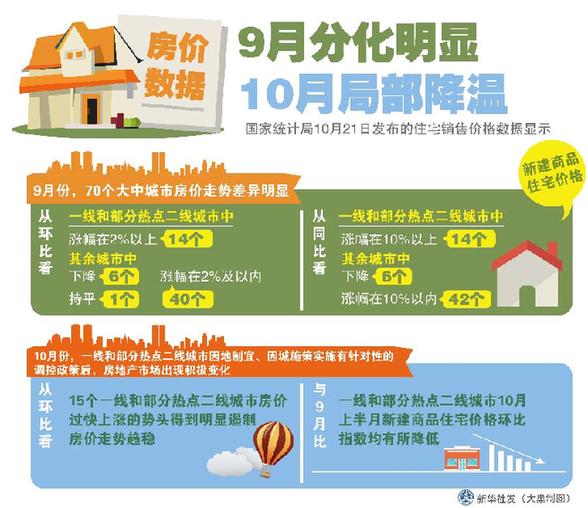 新華社北京10月21日電(記者王希)國家統(tǒng)計(jì)局21日發(fā)布的住宅銷售價(jià)格數(shù)據(jù)顯示,9月份70個(gè)大中城市房價(jià)分化明顯,10月份一線和部分熱點(diǎn)二線城市有針對性地實(shí)施調(diào)控政策,房地產(chǎn)市場明顯降溫。