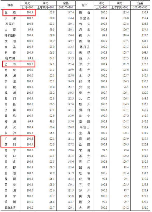 人民網(wǎng)北京10月20日電(記者孫紅麗)10月20日,國家統(tǒng)計(jì)局發(fā)布9月份商品住宅銷售價(jià)格變動(dòng)情況統(tǒng)計(jì)數(shù)據(jù)。經(jīng)初步測(cè)算,4個(gè)一線城市新建商品住宅銷售價(jià)格環(huán)比上漲0.4%,漲幅比上月回落0.2個(gè)百分點(diǎn)。其中,北京、上海、廣州和深圳分別上漲0.3%、0.5%、0.6%和0.4%。