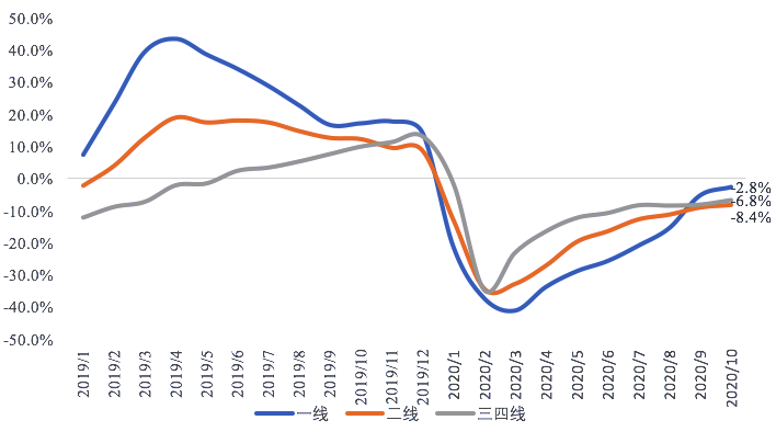 2019年至今66座大中城市合計月度成交套數(shù)與成交面積累計同比 (數(shù)據(jù)來源:WIND,10月數(shù)據(jù)為全月預(yù)測值) 貝殼研究院統(tǒng)計整理數(shù)據(jù)顯示,截止2020年10月一線城市新房市場成交量恢復(fù)逐漸放緩,其中成交套數(shù)累計同比下滑2.8%、成交面積累計同比下滑1.8%;二線城市成交套數(shù)累計同比下滑8.4%、成交面積累計同比下滑9.5%;三四線城市成交套數(shù)累計同比下滑6.8%、成交面積累計同比下滑4.4%。整體環(huán)比9月基本持平。一線城市新房市場10月持續(xù)領(lǐng)跑全國,二線以下城市累計成交量同比下滑幅度持續(xù)穩(wěn)定,調(diào)控升級后,市場動力一般。