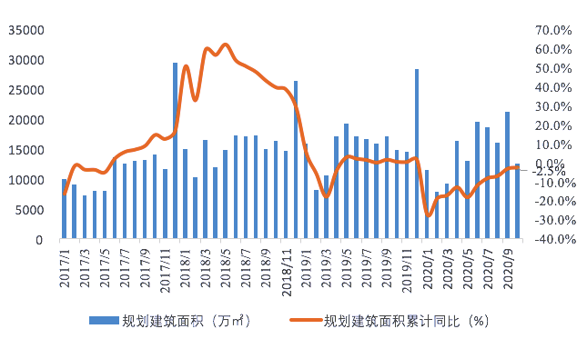 2019年至今66座大中城市中各線級城市合計月度成交套數(shù)累計同比(%) 數(shù)據(jù)來源:WIND,10月全部數(shù)據(jù)為全月預(yù)測值 全國土地市場: 粵港澳大灣區(qū)保持高熱度 貝殼研究院統(tǒng)計整理數(shù)據(jù)顯示,2020年10月(截至10月27日),全國351城整體住宅用地累計成交金額達(dá)4.6萬億元,累計同比增長12.9%。全國351城整體住宅用地累計成交規(guī)劃建筑面積14.6億㎡,累計同比降幅收窄0.6個百分點至2.5%。10月28日至10月31日,計劃出讓6734萬㎡以上,如果順利成交,據(jù)貝殼研究院測算,全國351城整體住宅用地成交規(guī)劃建筑面積累計同將進(jìn)入增長區(qū)間,增長幅度0.1%,市場追平去年同期。從目前的各城市出讓計劃統(tǒng)計可知,11月預(yù)計出讓規(guī)劃建筑面積1.7億㎡的住宅用地,如果全部成交,11月的住宅用地規(guī)劃建筑面積累計同比將增長1.2%。 2020年1-10月,粵港澳、哈長城市群成交量累計同比表現(xiàn)突出,城市群住宅用地成交金額及規(guī)劃建筑面積累計同比收窄之后,10月略有反彈。其中粵港澳大灣區(qū)成交金額累計同比、成交規(guī)劃建筑面積累計同比均排在第一位,隨著廣州、東莞、佛山、深圳等城市加大供應(yīng),住宅用地市場熱度較高。