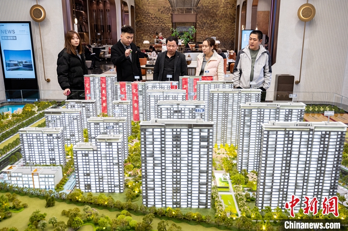 圖為3月7日,太原一家房地產(chǎn)公司新開樓盤吸引購(gòu)房者關(guān)注。 中新社記者 韋亮 攝