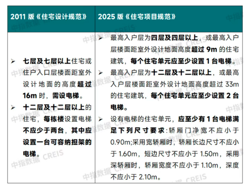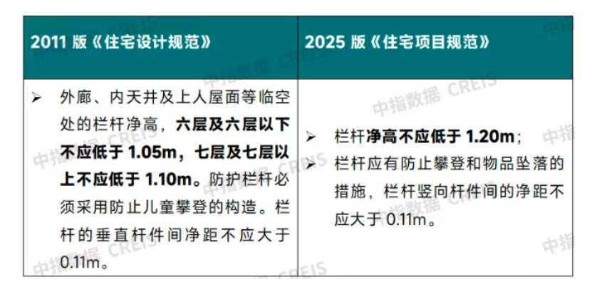 (圖源:中指研究院) 在曹晶晶看來,這一規(guī)定進(jìn)一步提升了居民出行便利性,解決低層住宅(如多層、小高層)老年人、行動不便者通行問題。 “這也意味著更多住宅小區(qū)尤其是低層住宅項(xiàng)目,都可以納入到‘電梯房’的行列中。”嚴(yán)躍進(jìn)稱。 此外,2011版規(guī)范雖然要求設(shè)置擔(dān)架電梯,但未明確擔(dān)架電梯的尺寸,且各地城市的標(biāo)準(zhǔn)也不相同,2025年新規(guī)統(tǒng)一了電梯轎廂尺寸,一方面便于電梯的設(shè)計(jì)、生產(chǎn)與維護(hù),降低成本;另一方面可確保擔(dān)架等救援設(shè)施進(jìn)入電梯,提升了應(yīng)急救援能力,讓居住更加安全。另外,對于十二層及以上住宅的電梯數(shù)量,也由原版“每棟樓不少于兩臺”調(diào)整為“每個住宅單元不少于兩臺”。 陽臺等欄桿高度提升至1.2米,提升居住安全性 2011版《住宅設(shè)計(jì)規(guī)范》按住宅層數(shù)對陽臺欄桿高度提出了不同要求,2022版《住宅項(xiàng)目規(guī)范》(征求意見稿)將陽臺欄桿高度統(tǒng)一調(diào)整為1.1米,2025版新規(guī)再次將這一標(biāo)準(zhǔn)提高至1.2米。