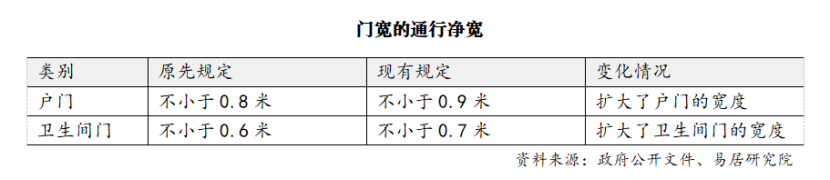 (圖源:易居研究院) 中指研究院指數(shù)研究部總經(jīng)理曹晶晶表示,隨著居民生活品質(zhì)的提升,人們對居住舒適度也有了更高的追求,比如通過加裝隔聲板來提升房屋隔音降噪性能,或者通過安裝新風(fēng)系統(tǒng)、中央空調(diào)、地暖等建筑設(shè)備來提升居住品質(zhì),而此次層高標(biāo)準(zhǔn)的提升,可以有效提高居住空間的適應(yīng)性。同時(shí),層高提升后,可以擴(kuò)大陽臺窗戶面積,改善室內(nèi)采光和通風(fēng)效果。此外,消費(fèi)者在裝修設(shè)計(jì)上也有了更大的靈活性,可以滿足不同家庭的個性化需求,提升居民的獲得感及幸福感。 值得關(guān)注的是,在“好房子”建設(shè)導(dǎo)向的推動下,2024年以來,多省市已先行調(diào)整層高地方標(biāo)準(zhǔn),新標(biāo)準(zhǔn)的要求普遍集中在3米到3.3米之間,如《江蘇省改善型住宅設(shè)計(jì)與建造導(dǎo)則》規(guī)定,改善型住宅的層高不應(yīng)小于3.1米,設(shè)有地暖、管道式新風(fēng)或集中式中央空調(diào)系統(tǒng)的改善型住宅層高不應(yīng)小于3.15米;《江西省商品住宅品質(zhì)提升設(shè)計(jì)指引(試行)》提出,住宅凈高不應(yīng)小于3.10米;《河南省好房子設(shè)計(jì)與建造技術(shù)導(dǎo)則》明確住宅層高不應(yīng)小于3.1米。 提高戶門、衛(wèi)生間門的通行凈寬,提升居住便利性 記者了解到,2011版《住宅設(shè)計(jì)規(guī)范》要求戶(套)門洞口寬度≥1.0米,但未明確指代凈寬,實(shí)際成品門或因門框、門扇厚度等影響,凈寬通常不足0.90米。2025版《住宅項(xiàng)目規(guī)范》明確指出,戶門通行凈寬不應(yīng)小于0.90米,戶門合理加寬可兼顧通透性與私密性,并提升緊急疏散效率。此外,新版規(guī)范對臥室門、廚房門、衛(wèi)生間門的通行凈寬也提出了具體要求。