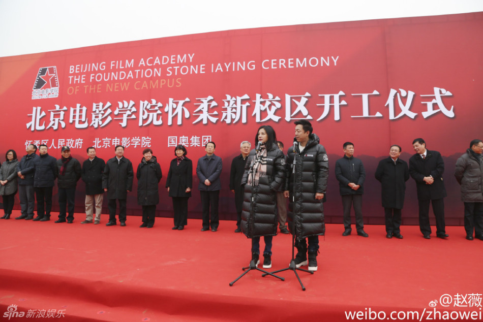 12月25日,北京電影學(xué)院懷柔新校區(qū)開(kāi)工儀式舉行。趙薇、黃渤作為資深校友現(xiàn)身奠基儀式,穿羽絨服鏟土。趙薇贊“地杰人靈之地!”