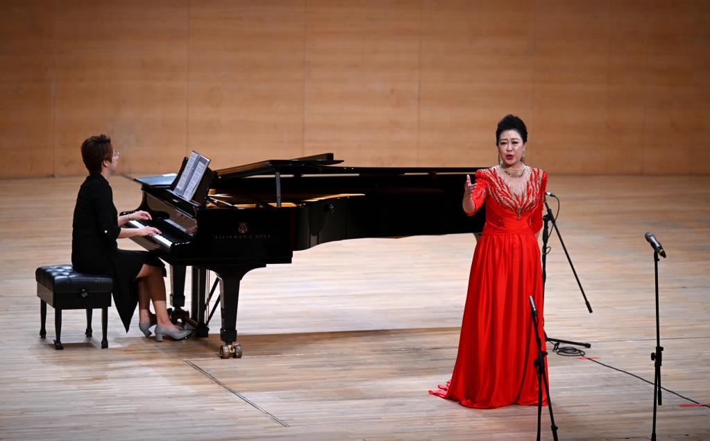 7月1日,天津歌舞劇院演員田京在演唱《萬(wàn)里春色滿家園》。新華社記者 趙子碩 攝