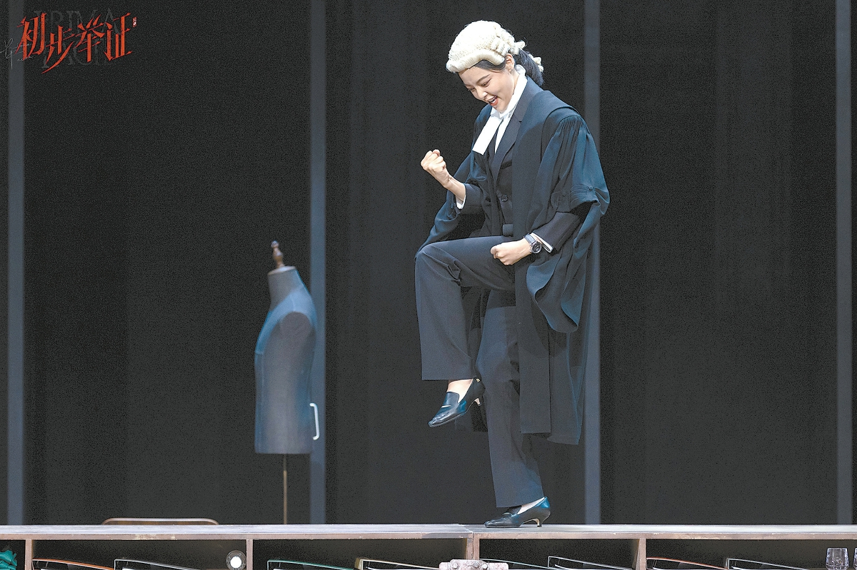 舞臺極為對稱。最醒目的,是兩側(cè)微微斜切向后景的賽馬欄。如果從上方俯視,賽馬欄將舞臺空間變成了一個等邊梯形,中央橫放著長長的組合式開架矮桌柜。這是由蘇西·米勒編劇、周可導(dǎo)演的獨角戲《初步舉證》中文版的現(xiàn)場。從大空間布局上看,中文版與2022年4月英國NTlive版有一定相似性。但舞臺布景的差異,還是顯示出導(dǎo)演不同的側(cè)重點。NTlive版以三面巨大的、裝滿卷宗的書柜構(gòu)成了半包圍式舞臺結(jié)構(gòu),舞臺中央是兩張大辦公桌。這一偏于寫實的布景突出了主角的律師身份,既富專業(yè)性,又有無形的壓迫感。中文版的賽馬欄則暗示庭辯仿佛賽馬,突出了律師爭當(dāng)“第一名”的渴望。從觀眾席望去,對稱的舞臺呈現(xiàn)出一種均衡和穩(wěn)定。演出開始后,伴隨有轉(zhuǎn)臺功能的矮桌柜的一次次旋轉(zhuǎn),主人公以她失衡的人生告訴觀眾:有些事情必須改變。