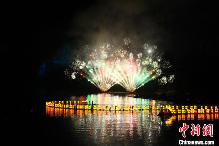 慶典演出現(xiàn)場人頭攢動,開場無人機表演在半空組合出紀念“印象劉三姐20年”的圖案,舞臺上擊鼓而舞的表演者渲染歡樂氛圍。以絢爛煙火為背景,漁翁表演者在江面組成蜿蜒長龍,引得游客們紛紛贊嘆拍照。慶典演出環(huán)節(jié),桂林旅游學院和《印象·劉三姐》的演員們共同表演的舞蹈《漓江·春茶》、百人合唱《侗族大歌》、實景展演《龍騰印象》等精彩節(jié)目,帶來一場視覺盛宴。