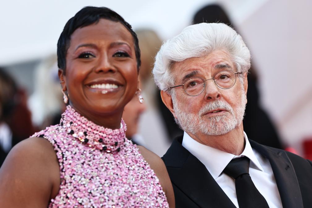 5月25日,在法國南部城市戛納舉行的第77屆戛納電影節(jié)上,美國導演、編劇、制片人喬治·盧卡斯(右)抵達閉幕式紅毯。新華社記者 高靜 攝