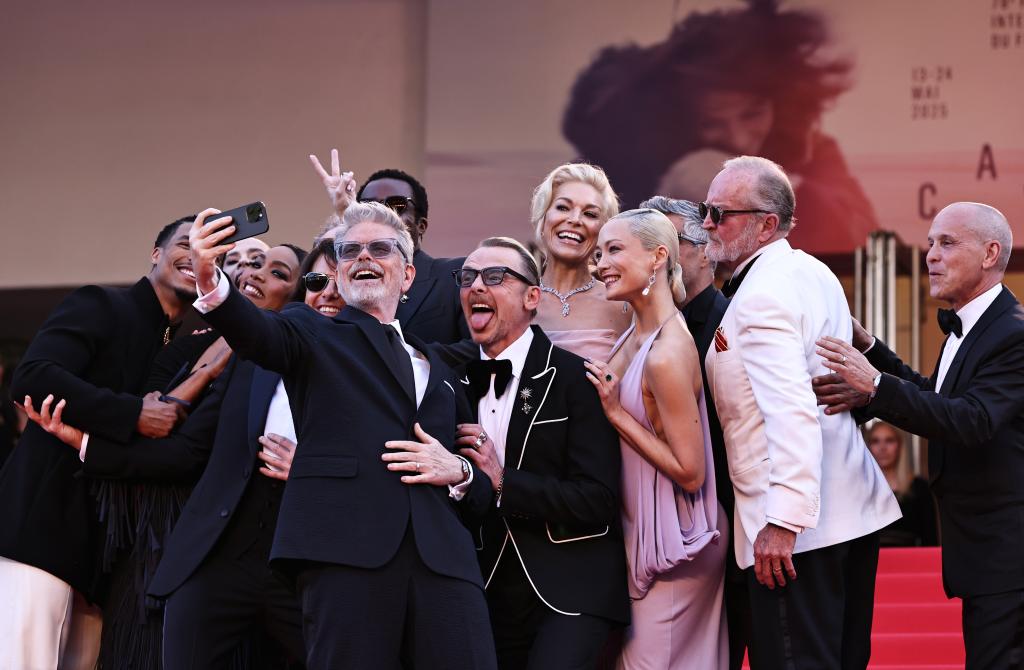 5月14日,在法國戛納舉行的第78屆戛納國際電影節(jié)上,美國導(dǎo)演克里斯托夫·邁考利(左五)等《碟中諜8:最終清算》主創(chuàng)人員在首映禮上自拍。新華社記者 高靜 攝