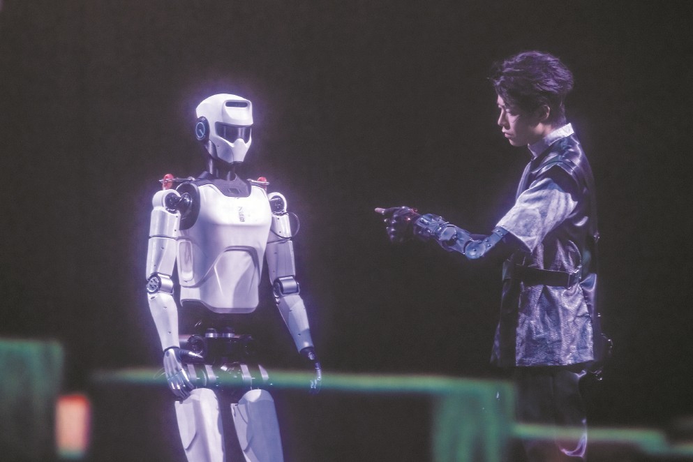 這是發(fā)生在中國大戲院長三角城市戲劇節(jié)中的最“科幻”一幕,國內(nèi)領(lǐng)先的機(jī)器人走出實(shí)驗(yàn)室和展廳,以接地氣、親和的方式來到普通人身邊。面對這樣的場景,人們不再那么陌生——2025春晚上,張藝謀導(dǎo)演的《秧BOT》讓人形機(jī)器人略顯滑稽地扭起秧歌;上半年,半程馬拉松也迎來人形機(jī)器人“跌跌撞撞”的身影?!拔覀冊谔剿饕环N可能性,試著模擬發(fā)生在未來的場景?!薄毒尬镏恰匪囆g(shù)總監(jiān)、上海戲劇學(xué)院藝術(shù)科技與管理學(xué)院副院長沈倩對記者說,“無論對于機(jī)器人還是演藝產(chǎn)業(yè)來說,都具有破圈的意義。”誠然,機(jī)器人仍在亦步亦趨地努力跟上人類的節(jié)奏,但其不斷前進(jìn)的腳步已經(jīng)令人激動。面對“人機(jī)共生”的時代命題,上海邁出了全國舞臺實(shí)踐的第一步。