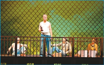 坐滿(mǎn)觀(guān)眾的劇場(chǎng),大幕拉開(kāi),燈光追隨,被判謀殺罪的銀行家安迪由獄警押解上場(chǎng)。身后的鐵牢籠里傳出起哄聲:“看吶,來(lái)新人了!”……