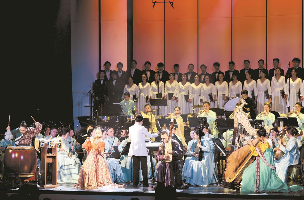 作曲家孔志軒分享了演出細(xì)節(jié),此次他優(yōu)化了第五與第六篇章?!暗谖迤隆讹L(fēng)骨錚鳴》擴(kuò)充原有結(jié)構(gòu),層層遞進(jìn)間讓風(fēng)骨內(nèi)涵更立體豐滿;第六篇章《星河共潮》則精簡結(jié)構(gòu),凝練打磨各部分音樂形象,核心是凸顯中華民族屹立不倒的民族氣節(jié)。”