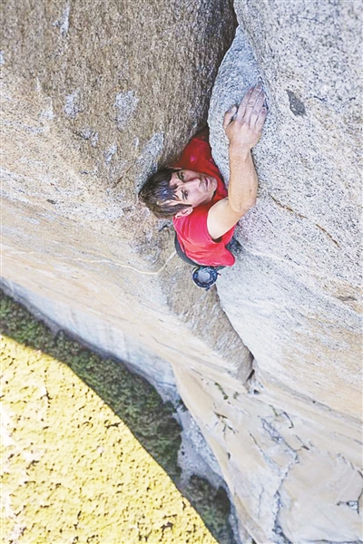 在亞歷克斯之前,從未有人以無保護的方式登頂過酋長巖。位于美國加州優(yōu)勝美地國家公園的酋長巖,是全球攀登界最有影響力的巨石,這塊花崗巖大石,從平地驀地拔起睥睨群倫,最高的垂直落差超過3000英尺(900余米),被稱為“攀巖宇宙中心”,是世界上最難完成的攀巖之一。一般攀巖高手在有保護的情況下會花三到五天的時間才能攀爬上去。但是,在2017年6月3日,亞歷克斯在沒有繩索、安全帶及其他防護設備的情況下,僅憑一小袋石灰粉,憑借著雙手雙腳,花了3小時56分鐘就成功登頂,亞歷克斯的這一壯舉被稱為是“無保護攀登界的成功登月”、“體育界最偉大的成就之一”。