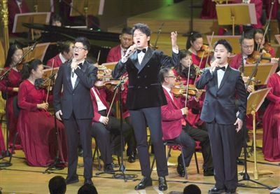 12月2日,《抒情新時代》慶祝中華人民共和國成立70周年新創(chuàng)主題歌曲音樂會在北京音樂廳上演,藝術(shù)家們演唱了18首新創(chuàng)歌曲。為了更好地完成這批主題歌曲的創(chuàng)作任務,來自全國各地的近百名藝術(shù)家從西柏坡出發(fā),到延安、古田、湘江、瑞金、井岡山等地采風,并將這些體驗寫進了音樂旋律之中。圖為王凱(前中)、廖佳琳(前左)、趙越(前右)演唱《祖國正青春》。
