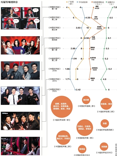 直到2018年,《中國(guó)好聲音》品牌回歸,一切看似恢復(fù)原來(lái)的模樣。但江山已逝??v觀2018、2019、2020三年的平均收視率、口碑評(píng)分和選手熱度,今年在沒(méi)有輸出至優(yōu)愛(ài)騰平臺(tái)的情況下,綜合表現(xiàn)竟然超過(guò)了前兩年。但在“影視話題晴雨表”的豆瓣上,這一季的評(píng)分人數(shù)僅2800余人,只有八年前的十分之一而已。