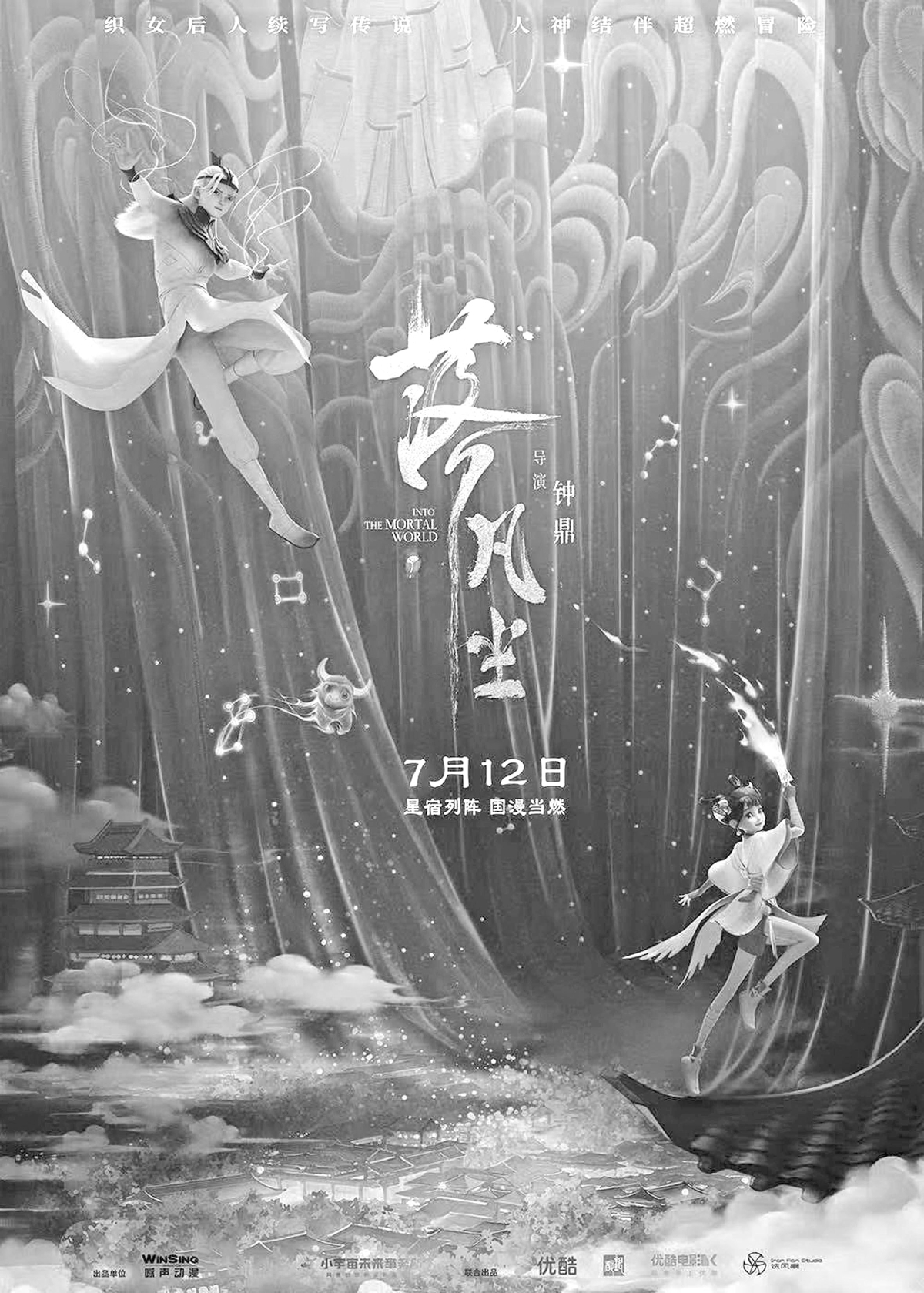 電影《落凡塵》在短片基礎上進行劇情擴容,融入了二十八星宿的神話元素,首次將這一概念搬上大銀幕,還進行了“牛郎織女神話故事新編”。鐘鼎表示,這相當于一個全新的原創(chuàng)故事,“以往的民間傳說中,牛郎織女并沒有太多延展。而在《落凡塵》中,金風玉露這對兄妹不僅追溯了母親身份,而且凸顯出了電影親情的主題。此外,織女的形象也得到了創(chuàng)新性的改編,不再是傳統(tǒng)故事中被動等待愛情的形象,而是變成了一個心懷蒼生的女性?!?/p>