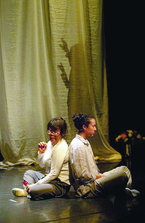 于是在《萬噸月色》的編排中,有兩名專業(yè)舞者圍繞著余秀華,她們分別隱喻著光明和陰影的意象,處在光明中的舞者美麗無瑕、人人向往,隱在陰暗中的舞者幽深難測、焦慮不安。這是對余秀華的內(nèi)心世界和她的詩歌意象的直觀再現(xiàn):這個傲視世俗偏見的詩人,也曾困惑于“他人的眼光”,她曾渴望光亮,害怕墜入暗淡,恰似她手持玫瑰登場,但這些花束變成砸向她的武器,而她的勇敢在于,在承受過偏見與傷害之后,她放下了“被認(rèn)可”的執(zhí)念,擁抱不完美的自己,自我和解。