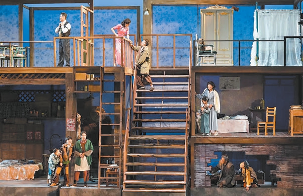 生動(dòng)樸實(shí)的階層群像,是《烏鴉與麻雀》的一大看點(diǎn),話劇對(duì)他們的塑造不限于軋金子、打麻將、搶盤(pán)尼西林等細(xì)膩熱絡(luò)的日常生活,也在舞臺(tái)空間中埋下種種暗喻,比如,公寓的布局設(shè)計(jì)耐人尋味,這是黃盈從電影中延續(xù)下來(lái)的靈感,高居頂樓的“烏鴉”、“雙腳離地”的知識(shí)分子、撐起社會(huì)基石的普通市民……房間的位置正是當(dāng)時(shí)社會(huì)現(xiàn)實(shí)的寫(xiě)照,在舞臺(tái)藝術(shù)中,階層間的壁壘與對(duì)比被格外立體地展現(xiàn)出來(lái)。