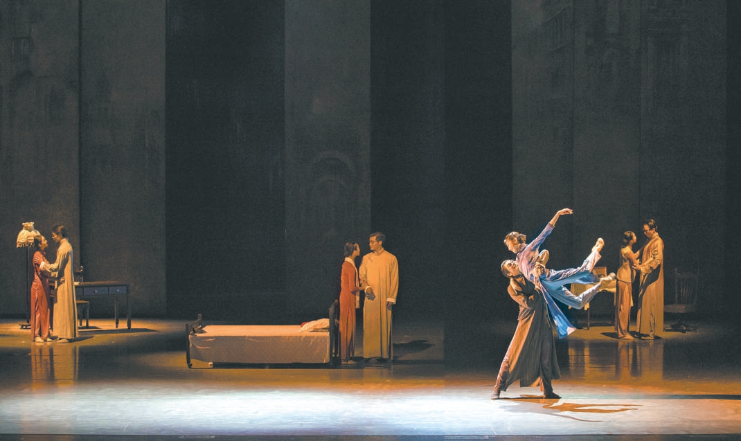 《永不消逝的電波》是韓真、周莉亞這對(duì)“舞壇雙子星”較早“出圈”的舞劇,在觀眾心中留下了很多經(jīng)典舞段。十余位身穿旗袍、手持蒲扇的女舞者,在《漁光曲》的旋律中曼妙起舞,浸透老上海風(fēng)情;與之產(chǎn)生強(qiáng)烈對(duì)比的是,披著黑色斗篷的特務(wù)在冷雨夜展開驚心動(dòng)魄的追捕;李俠與蘭芬從假扮夫妻到發(fā)展為真正的愛人,幾對(duì)舞者的雙人舞同臺(tái)綻放。這些片段時(shí)常在舞蹈愛好者腦海中盤旋。