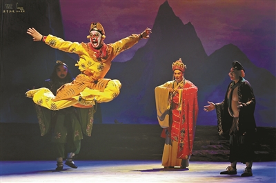 此外,該劇還利用舞臺技術(shù)突破了傳統(tǒng)戲曲的節(jié)奏,使之更為緊湊連貫。比如白骨精定下計謀要去偵探唐僧情況時,舞臺光暗,一個發(fā)光小球飛升直達天幕,暗示白骨精元神飛出洞府,同時伴有類似影視音效作為烘托;而在唐僧狠心驅(qū)逐孫悟空時,孫悟空向八戒沙僧交代完后,從上場門下場,后場馬上就安排一個孫悟空替身吊威亞從上場口飛到下場口,過程連貫自然,這都是受到電影藝術(shù)啟發(fā)的創(chuàng)新。