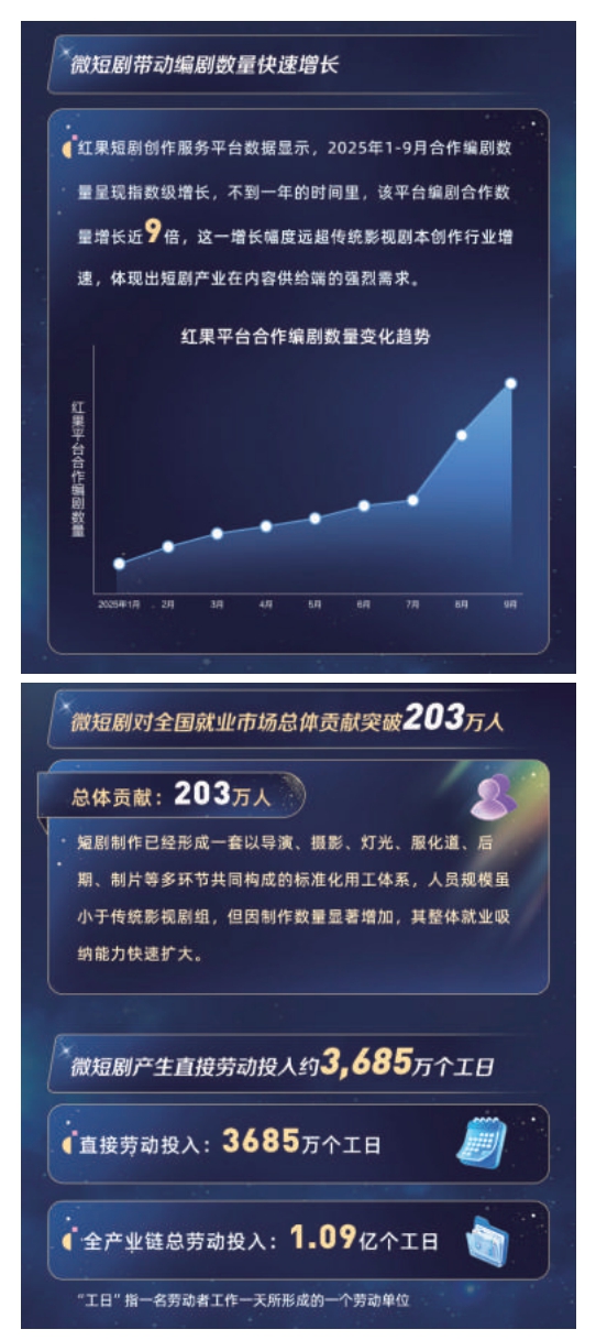 這不僅大幅提升了人力資源的利用效率,也為從業(yè)人員帶來了長期且穩(wěn)定的工作預期,吸引了大量人才涌入。以編劇為例,紅果短劇創(chuàng)作服務(wù)平臺數(shù)據(jù)顯示,2025年1-9月合作編劇數(shù)量呈現(xiàn)指數(shù)級增長,不到一年的時間里,平臺編劇合作數(shù)量增長近9倍,遠超傳統(tǒng)影視劇本創(chuàng)作行業(yè)增速。