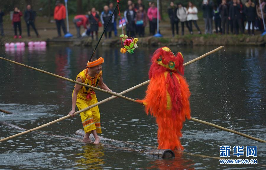 1月1日,“獨竹漂”愛好者在花溪河上表演水上高難度平衡動作。 2016年元旦,在貴陽市花溪公園平橋河段舉行的貴陽市第31屆冬泳表演活動中,數十名“獨竹漂”愛好者在花溪河上腳踏漂浮的竹竿,表演“金雞獨立”、轉身平衡等高難度動作,讓觀眾大飽眼福。新華社發(fā)(秦剛 攝)