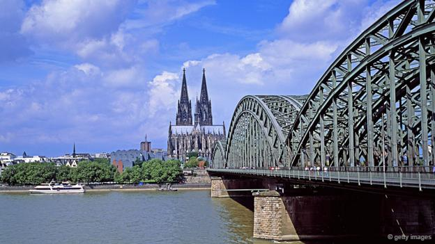科隆霍亨索倫橋始建于第一次世界大戰(zhàn)前,該橋設計獨特,體現(xiàn)了當時石材工程與鋼鐵結(jié)構(gòu)的完美結(jié)合。大橋于1911年完工,橋長共409米,橫跨萊茵河。1945年3月,為了減緩盟軍向柏林行進的速度,橋梁被德軍炸毀?,F(xiàn)在該橋已被成功修繕并成為德國最繁忙的鐵路線路。橋上的鋼鐵結(jié)構(gòu)形似鯨魚的脊背,柵欄上掛滿了情侶們的“愛情鎖”。如今這座橋已經(jīng)成為團結(jié)和愛的象征。