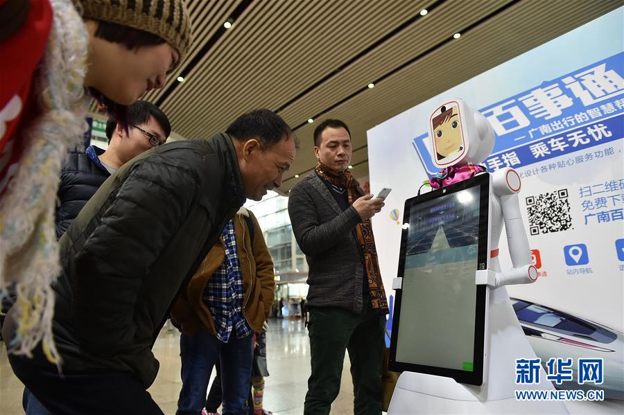 2月1日,旅客們在廣州南站與智能機(jī)器人“小璐”對話。當(dāng)日,一臺(tái)名叫“小璐”的智能機(jī)器人亮相廣州南站,吸引了大批旅客的圍觀,大家紛紛嘗試與“小璐”對話,向她咨詢列車時(shí)刻、購票信息、天氣情況等問題,“小璐”不僅可以用甜美的女聲一一作答,還可以在接收到語音指令后,為旅客“唱歌”和“跳舞”。據(jù)了解,使用智能機(jī)器人服務(wù)旅客是廣州南站在今年春運(yùn)中的新嘗試,如果試用效果良好,今后有望在車站中看到更多智能機(jī)器人的身影。新華社記者 梁旭 攝