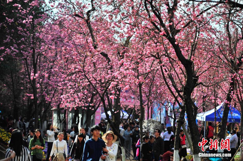 近日,昆明圓通山的櫻花和海棠花逐漸進(jìn)入盛花期,引來眾多市民踏春趕花潮。圓通山工作人員介紹,受此前寒潮的影響,海棠和櫻花花期推遲,但顏色比往年更艷麗且花量增加。中新社記者 劉冉陽 攝